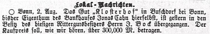 Klosterhof 1881 von Bankhaus Jonas Cahn an Rittergutsbesitzer J. Bock verkauft (Familie gründete den jüdischen Friedhof in Hersel). Quellen: wikipedia.org, Zeitungsmeldung 1881: