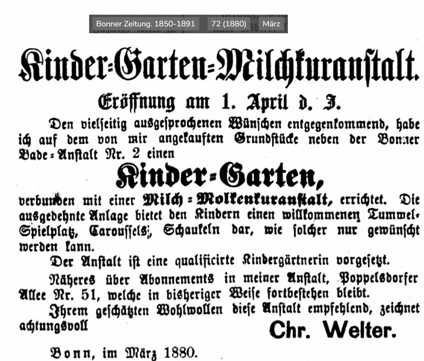 | ca. 1868-1881 Pächter Christian Welter | Klosterhof Buschdorf | Schwerpunkt: Milch vom Klosterhof, Vertrieb bis in Verkaufsstellen in Bonn, 1868-1881 vielfache Zeitungsanzeigen. 1879 Milchkur-Anstalt Poppelsdorfer Allee, neben der Sternwarte, Gelände abgekauft von Albert Cahn. 1880 weiteres Projekt: