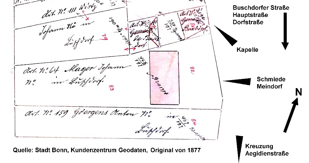 1877, Karte der Stadt Bonnlinks von der Kapelle Die Straßenfront des Geländes war um 1877 noch unbebaut und gehörte der Familie Mager. Die Karten aus diesen Jahren zeigen nur im hinteren Teil ein Gebäude (Scheune?), also sind die beiden Meindorf-Gebäude (direkt an der Straße gelegen) erst danach erbaut worden.